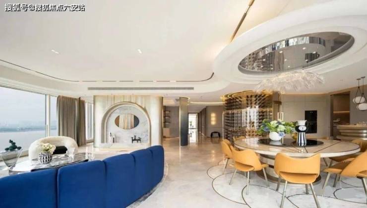 客厅中,钱塘江的柔美曲线,融入弧形吊顶与奢石拼花;19米的超大面宽,以270°环绕视野尽揽钱塘江景,让江河倒影和城市天际线在家中交汇。这是建筑与自然的对话,更是生活与艺术的融合。