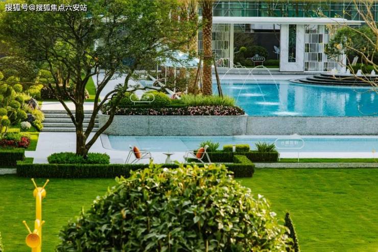 并且项目还通过大量的玻璃幕墙+局部铝板等建筑元素的恰当组合,作为一个低密的纯洋房大盘,翠栖府在园区中央打造了颠覆性的“六翠之境”:目之所及是一片通透的蒂芙尼蓝,镜面泳池里波光粼粼,倒映着蓝天白云,是真正的“天空之镜”,与边上高大的棕榈树、白色的躺椅、繁茂的绿茵,彼此映衬,海边度假风油然而生。
