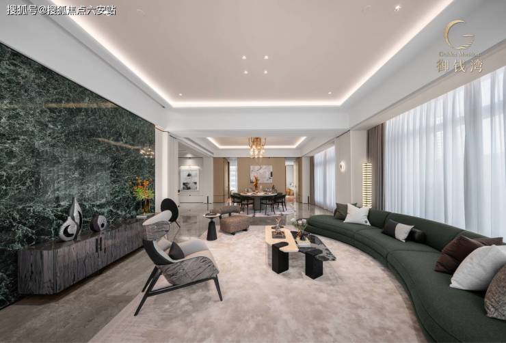 建面约410㎡“湾潮”户型:由WSD上海世尊团队以“摩登东方”为设计语言打造。LDK一体化方厅面积达109㎡,衔接50米U型跑道阳台,提供270°环幕视野。主卧套房配置双衣帽间及观景浴缸,还设计了法式艺术走廊,将东方雅韵与现代生活需求完美平衡。