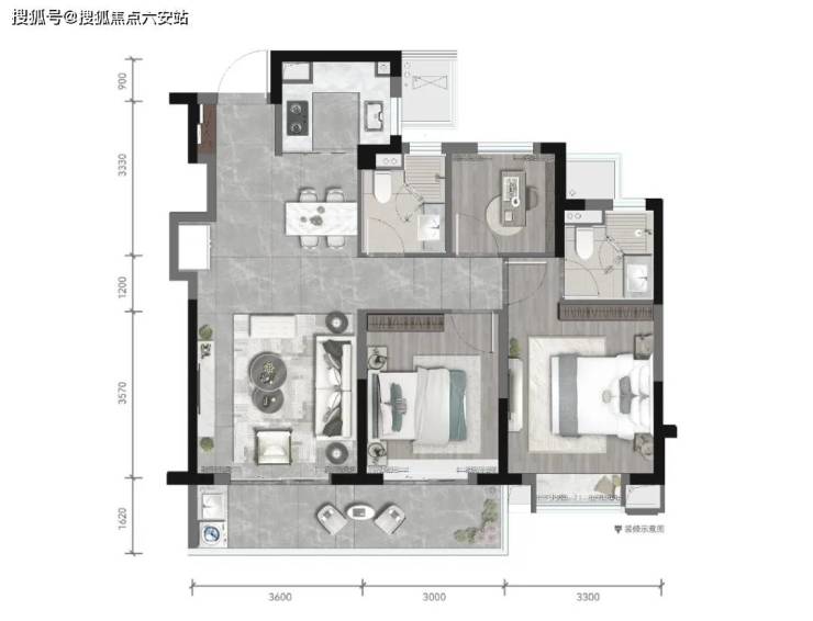 双玄关的设计,让归家更有仪式感,收纳空间进一步增加。入户后阔气的餐客厅,联通约7米的跑到式大阳台,给人一种置身于大平层的尺度感。