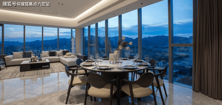 三面超白玻幕墙设计,270°环景视野,约17米巨幕面宽将四季山岚引入室内,70㎡无梁大板客厅与松涛声共鸣。- **复合功能**:首创“办公会客+宴会休憩”复合模式,东边套四房三卫双主卧,西边套四房四卫三朝南套房,空中酒廊与中西双厨满足商务与生活平衡。