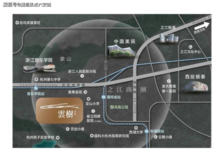 项目择址西湖区之江板块核芯,北望西湖群山叠翠,南瞰钱塘江潮涌,与中国美院象山校区(直线1.5公里)、浙江音乐学院(直线2公里)构成人文艺术金三角。半径3公里内,西投银泰城、之江文化中心(浙江四馆)、学军小学之江校区等顶配环伺,地铁6号线、规划12号线双轨交汇,实现“出享繁华,入则静谧”的城央墅居格局。
