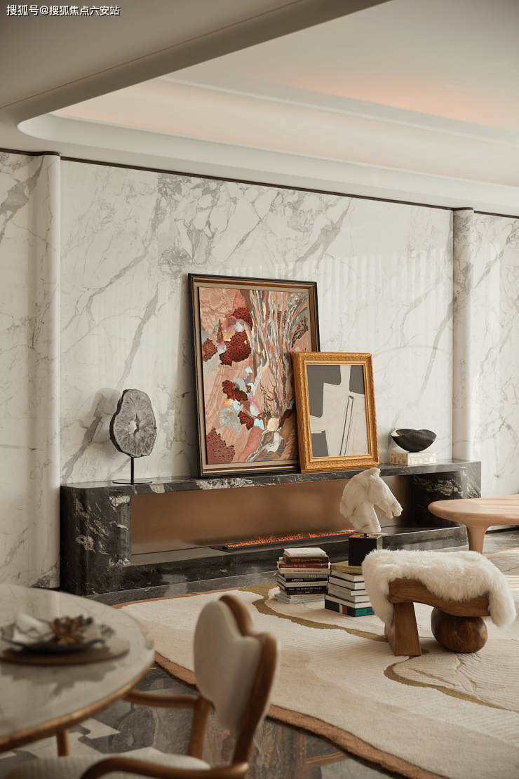 主背景墙:大花白大理石山纹肌理如写意水墨,与银河金大理石壁炉的温暖色泽碰撞,勾勒温馨氛围;