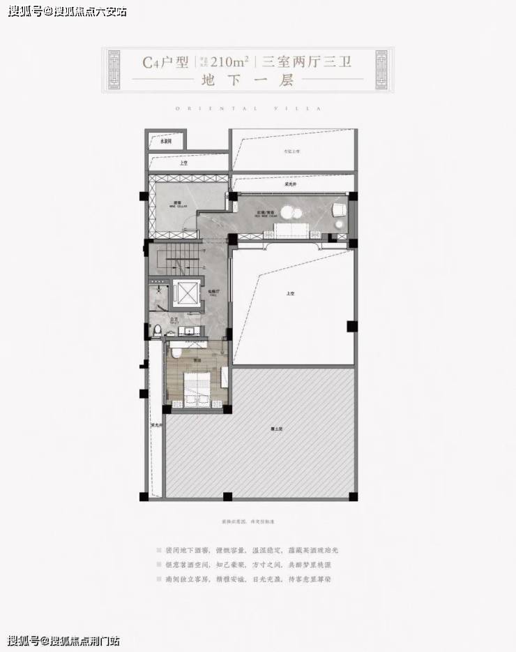 项目地下空间挑高约5.9米,器宇轩昂,至少两个宽屏采光井直通而下,落地空间更大,室内可以最大程度向自然打开。部分还带有下沉式庭院,将传统园林中的侧院概念引入地下,配合绿植、卵石、青苔,打造更有禅意的理想家园。