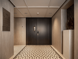 其创新性在入口处展现得淋漓尽致:常规沿街楼栋通常直接由物业用房过渡至住宅二层,但该项目在物业用房上方特别增设了架空层,形成"物业用房-架空层-住宅二层"的独特空间序列。这一设计突破性地通过地面整体抬升,不仅解放了沿街楼栋原本受限的架空层空间,更创造出尺度恢弘的入户大堂,使归家动线在垂直维度上获得仪式感的升华。