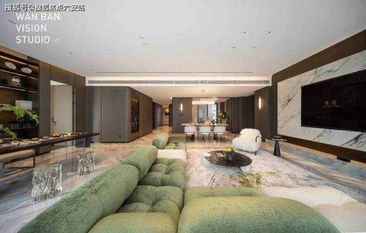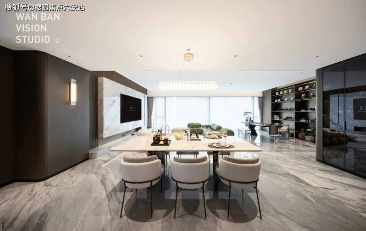 客厅背景墙更像是一场世界顶级石材展览,西边套用的是巴西进口石材天宝石,高贵中带着优雅;东边套用的是意大利卡拉拉大理石中的顶级「雕刻白」系列,我们熟知的世界著名雕塑《大卫》雕塑、世界著名建筑比萨斜塔等等,用的就是这一种石材。