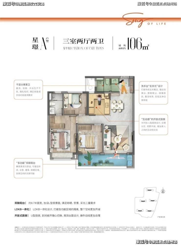 约106㎡户型点评:双联阳台约6.7米面宽,加设L型俯景面,满足晾晒、赏景、采光三重需求,LDKB一体化设计,打破各功能区域的隔离,整个空间更加开阔,开放式厨房 U型厨房,封闭敞开随心切换,高效台面设计,操作动线更加合理