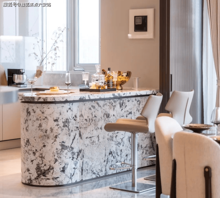 步入样板房内,目之所及,遍布芬迪白、喜马拉雅灰、雪山蓝等名贵奢石,将“浮华”二字堆砌得恰到好处;除此之外,大量深色木饰面的运用,则让整体风格显得低调而沉稳。吊顶、墙面,随处可见的弧形元素,炫技的同时又增添了温馨调性,奢华中带着松弛感。