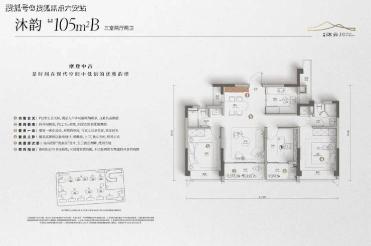 中间套建面约105㎡B户型,则是市面上少见的四开间朝南户型,加上约12.7m开阔大面宽的人性化配置,使得该户型的三间卧室+客厅,都能闻到阳光的味道。
