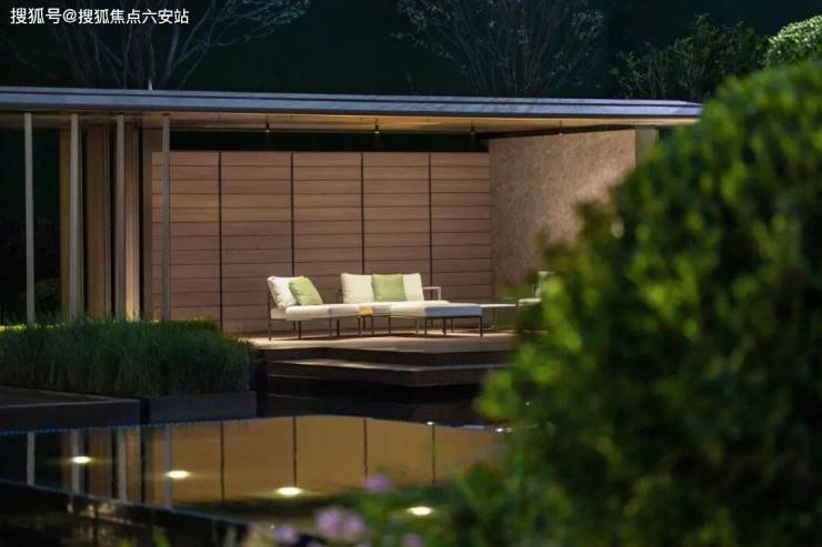 因为南临一线东沙湖拥有得天独厚的水系自然资源,项目景观借鉴曼谷四季酒店设计灵感,在社区人行入口、中央景观、核心节点区域铺陈多处水景,将整个小区打造成一座“微缩的东沙湖”。