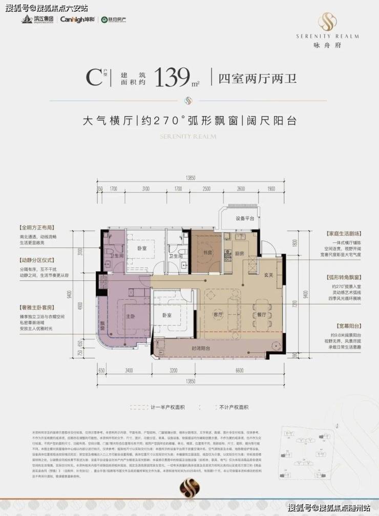 还有建面约139㎡的四室两厅两卫户型:一款是四开间朝南的横厅户型,南向约13.85米的极致采光面,阳台也有约9.8米;动静分区,私密感超强;主卧套房带L型弧形转角飘窗,居住体感堪比全景舱。