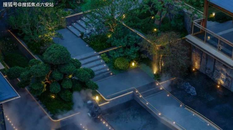 樾青岚空间如画,场景如诗,项目的主入口是宋代名画《溪山行旅图》的意象。层层叠叠的黑金砂石,做出了宋画中高耸的山体;还有飞流直下的瀑布,和仿佛山上楼阁般的会所屋檐。
