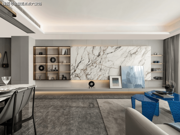 大面积的岩板,强化了整个客厅的纵深感,保持整体空间的统一与完整;同时,落地窗将天光与风景由窗引入,拉长空间的维度,任由外物肆意入侵,加强空间的感知,成为维度中“鲜活”的叙述。利用空间动线,客餐厅一体化,既划分功能界限,保持相对独立;又相互开放,增强家庭互动趣味性。