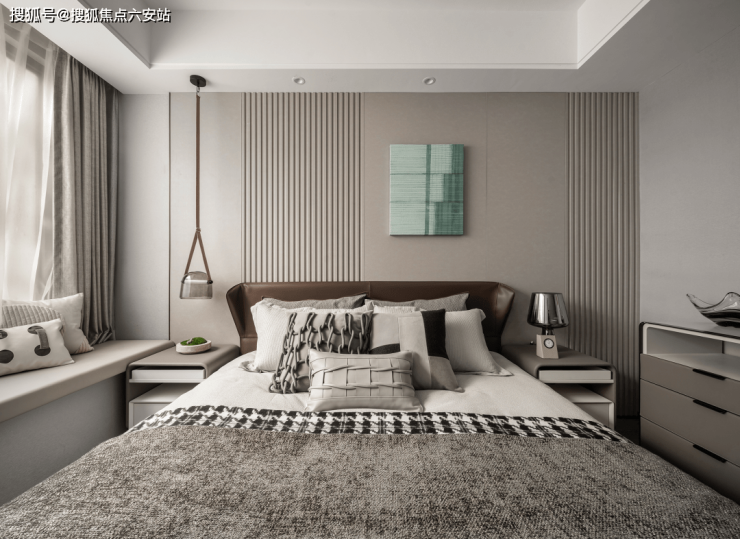 从公共空间进入私密空间,以简单去还原空间重要的定义,将单纯的功能性置入,静待与人形成各种积极的价值反应。主卧中,柔和的室内色调,格栅的硬包背景、皮质的家具与柔软的布艺,共同营造出舒适惬意的温馨环境。