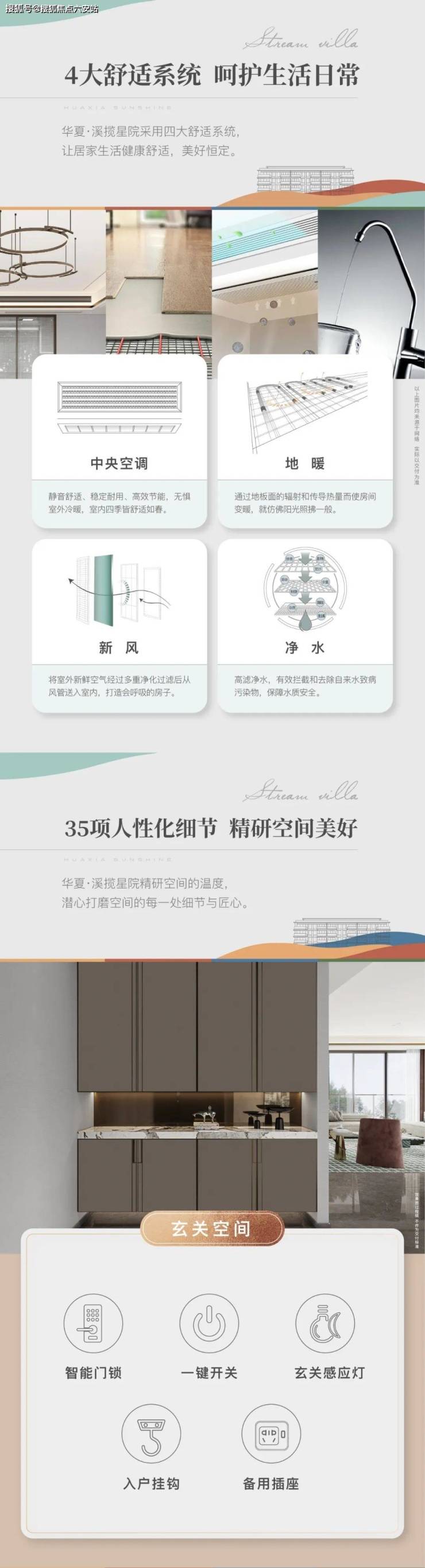 溪揽星院还甄选国内外知名精装品牌,全屋标配有中央空调、新风、地暖、净水四大件,而这些基本出现在杭州4W+的项目配置中。