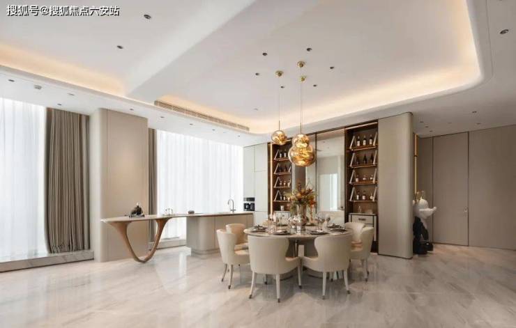 室内设计上,采用LDK一体化设计,带来极具阔正的空间尺度,并以大面米灰、暖灰为主基调,营造出高级优雅的氛围感,同时通过吊灯、艺术玻璃、酒柜等软装艺术作点缀,将艺术与生活融合,简奢中透出时尚前卫,营造出私密、温暖、现代化、国际化及独特的鼎级舒居体验。