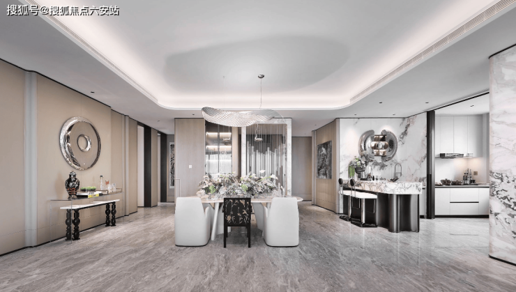 公区方厅更是彰显尺度感,建筑面积超90㎡,南向开间约19米,这样的尺度足以媲美市面上四五百方户型的客厅,举办超大型party也毫无压力。整体设计以浅白色为主,客厅背景墙铺贴大面积芬迪白大理石,弧形造型搭配木饰面,再加上酒店级灯光设计,让整个空间既奢华大气,又不失温馨质感。专属门厅空间从电梯厅延伸至家中,宛如一处艺廊,放慢人们的情绪,室内选用浅金色奢石(外界也称“芬迪白大理石”)作为主要石材,曲面浅色系木饰面,整体呈现出明亮通透的视觉效果。