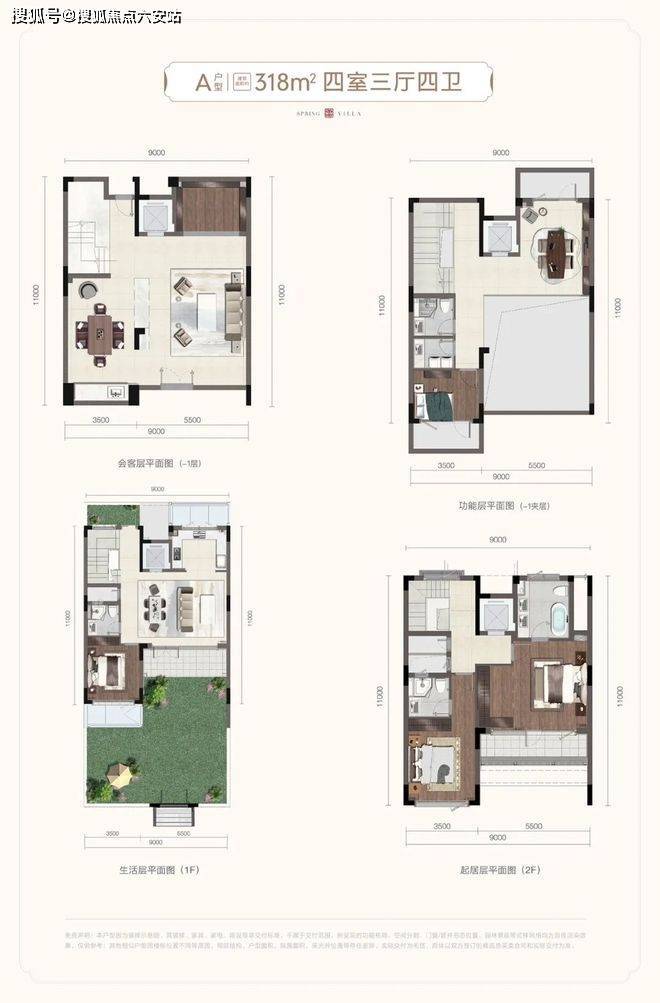 以318㎡户型为例,规划了4房3厅4卫,单层南向面宽约9米,以超大横厅围合一院大方之家。