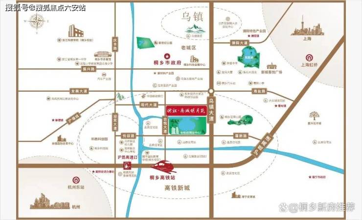 滨江·南城明月苑项目位于乌镇大道与现代大道城市双主轴, 可通达桐乡各个区域,市政交通便利;距离高铁站约2公里处,乘坐沪杭高铁,从桐乡到杭州火车东站高铁仅 17 分钟,到上海虹桥站高铁也仅需40分钟;而且沪杭高速路口离项目仅约3公里,开车也可快速可抵达杭州、上海。