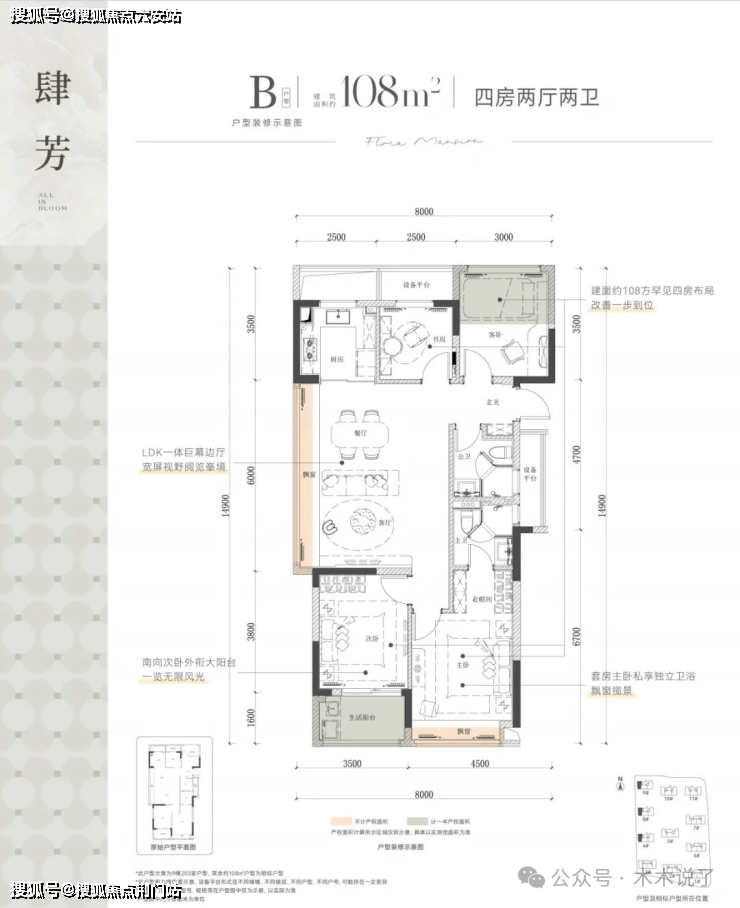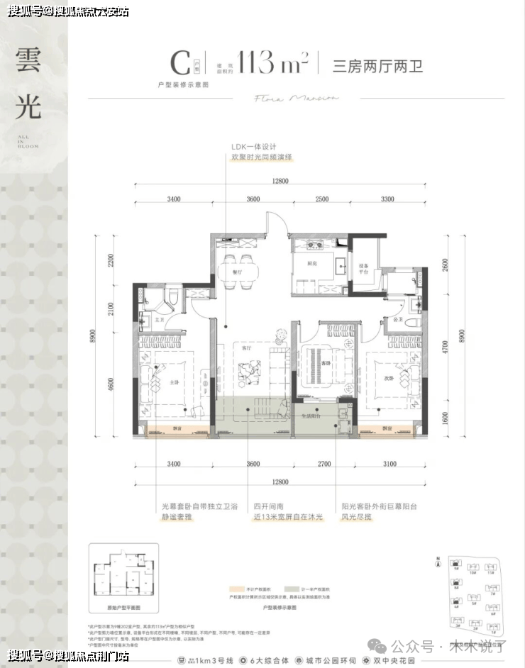 户型设计:建面约99㎡的三房两卫户型,动静分区,采用三开间朝南设计。建面约113㎡的三房两厅两卫户型,四开间朝南,拥有封闭式阳台,南向采光充足,使得整体空间更加宽敞明亮。