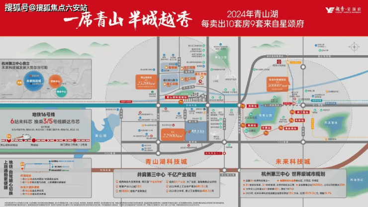 ——项目比邻地铁16号线“青山湖科技城”站; 两站直达未来科技城“南湖”站,6站“绿汀路”站,换乘3/5号线瞬达市区;周边杭州二绕西复线、科技大道、102省道、杭徽高速环伺; 杭州西站枢纽,满足铁路出行需求。