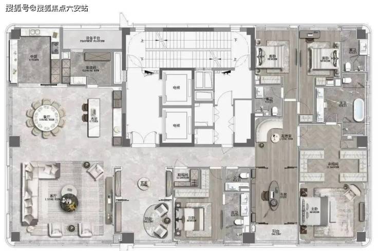 410㎡湾潮户型:WSD上海世尊团队执笔,以独一无二的“摩登东方”设计语言,抽象提取东方写意精神,与复古摩登、自由艺术平衡相融,领潮钱湾黄金时代。