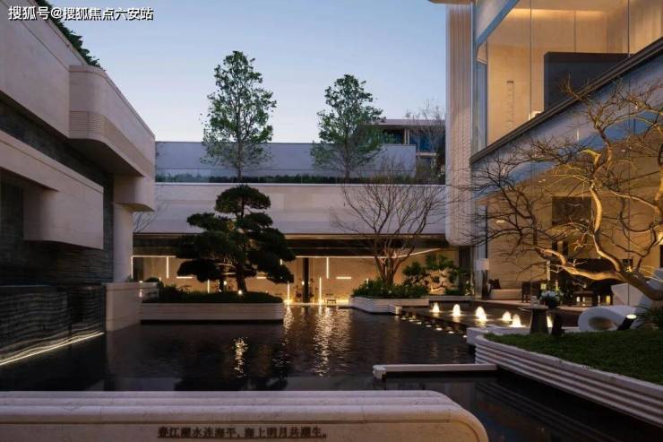 二进弧光织境,讲究“天圆地方”、“四水归堂”,中心水滴造型雕塑,形如宝瓶美轮美奂。