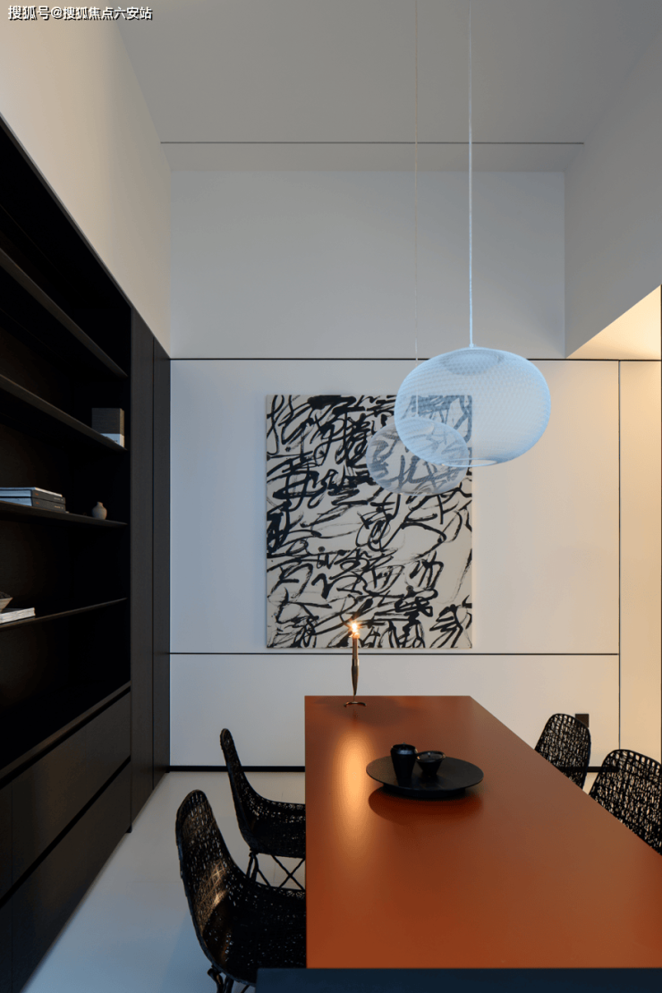 红色桌面被暖色的灯光调和成了爱马仕橙色,更显空间整体的品位和质感,网状的藤编座椅略带自然的气息,张扬之中有着内敛的氛围。