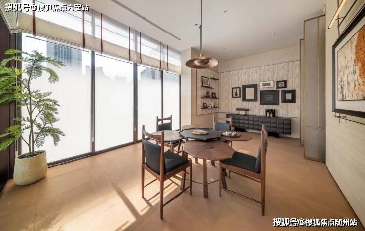 而270°转角环幕飘窗设计,成为室内最生动的风景艺术。大尺度玻璃墙,辉映西湖的晨雾、茶山的暮霭、城市的灯火,在这里,四季更迭不再是窗外的风景,而成为生活的一部分。
