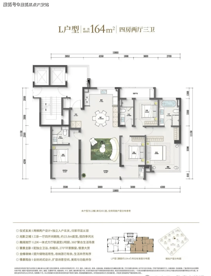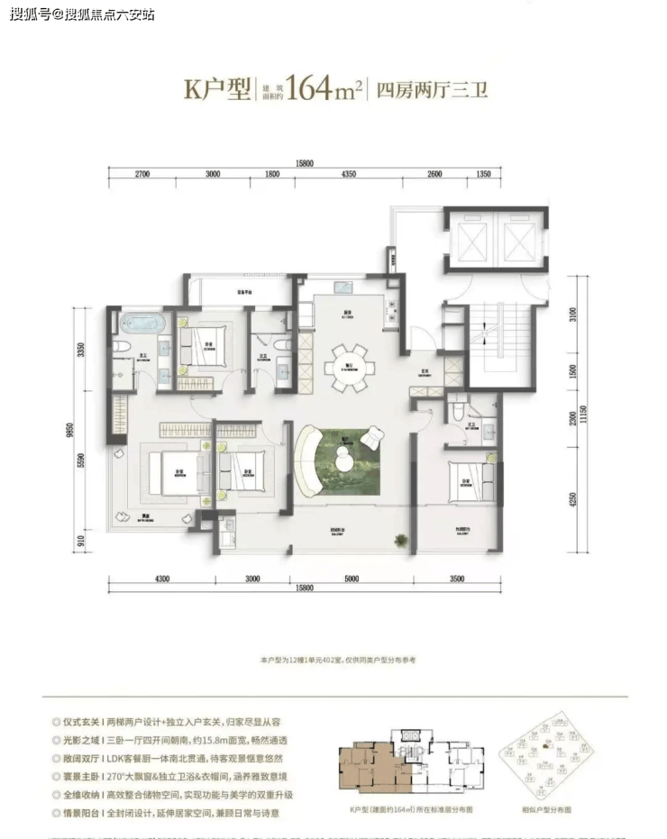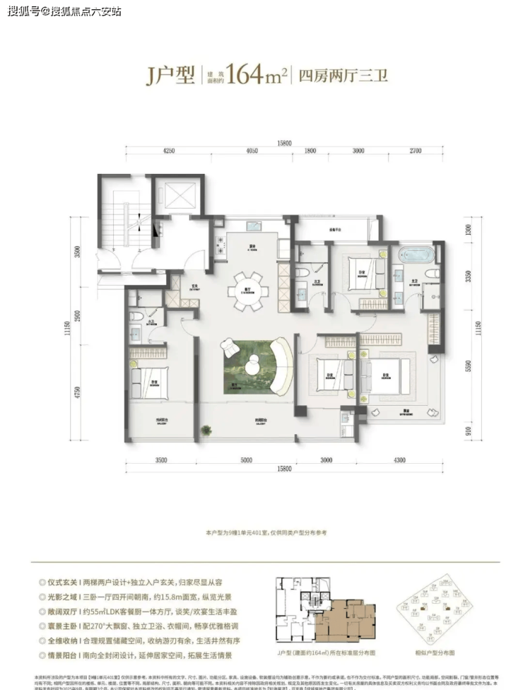 164㎡大平层:双主卧套房+270°转角阳台,全屋五重收纳系统,得房率高达88%,高端改善标杆。