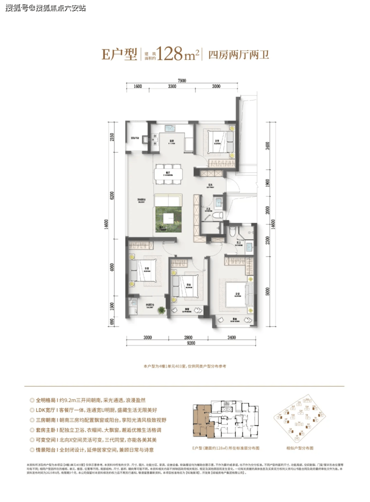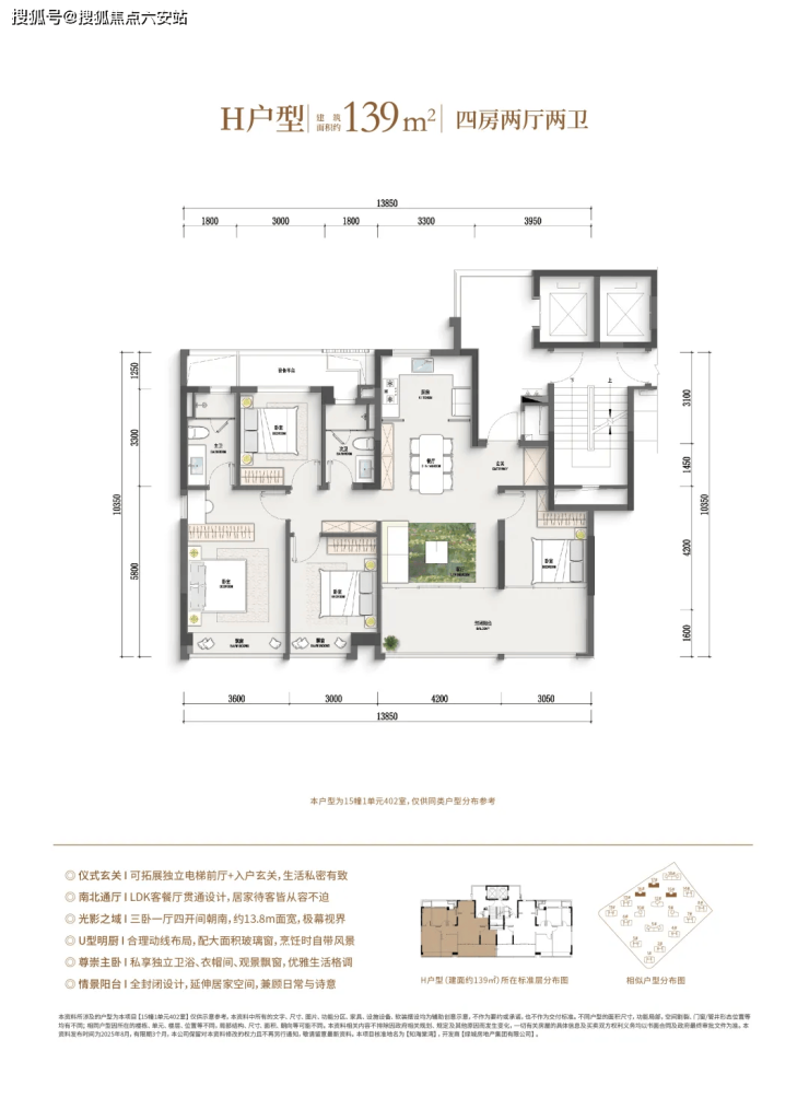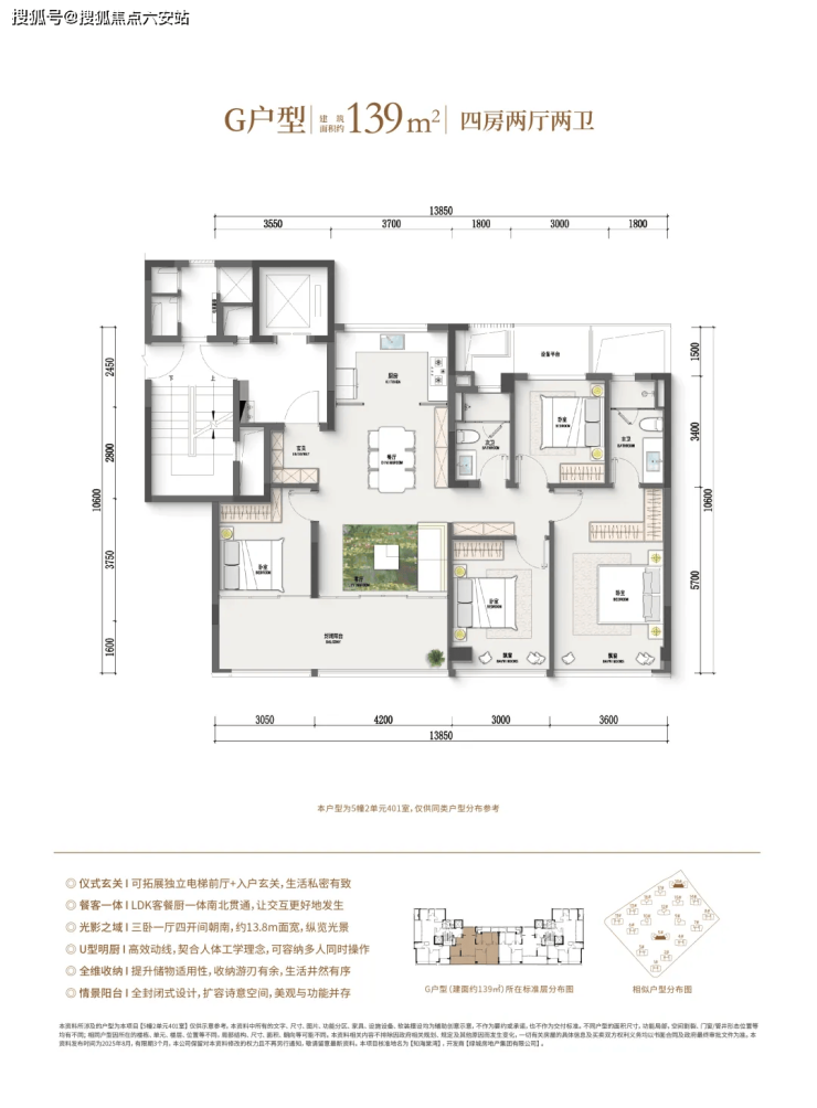 139㎡四房两卫:横厅边套设计,三卧朝南,双阳台配置,主卧套房配备独立卫浴与衣帽间,适配改善家庭。