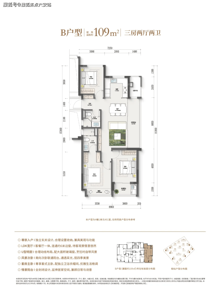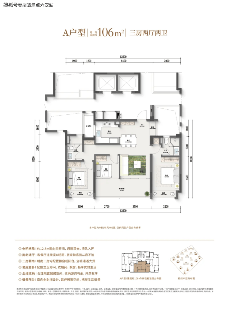 106㎡三房两卫:四开间朝南,南向采光面达12.5米,LDK一体化设计,得房率超85%,总价310万级起,刚需首选。
