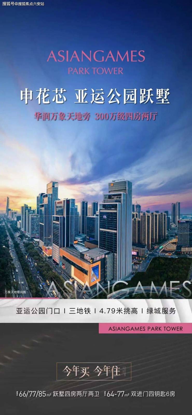 85㎡四房两厅两卫:挑高客厅+四房配置,东瞰华润综合体,西拥亚运公园景观。