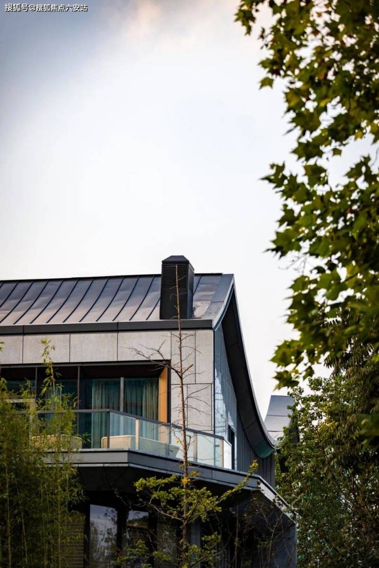 南郡涵云轩的建筑设计风格融合了现代与古典的元素,展现出一种既时尚又典雅的风格。屋顶采用东方传统的人字坡顶设计,搭配大面积落地玻璃窗,模糊了空间的边界感,使建筑内部与外部协调融合。