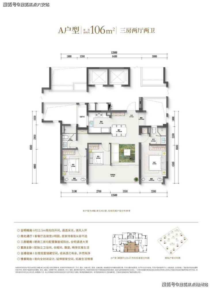 全封闭阳台设计(封闭部分仅计一半面积)提升得房率,106㎡户型赠送约12㎡拓展空间,128㎡以上户型配置双主卧套房及6-7米景观阳台。