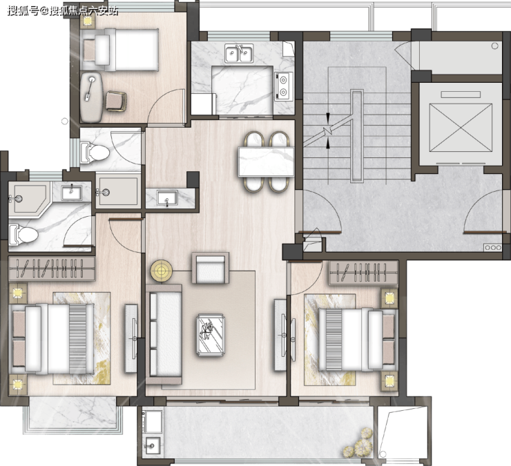 建面约88m²三房两厅一卫:南北双阳台设计,主卧+次卧+书房灵活布局,小面积实现多功能空间。