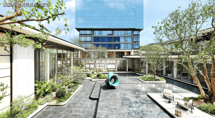公建化的立面,四面铝板搭配大面积玻璃,阳台统一封包,底层的浅色天然石材还被打磨出弧线,脱去厚重外壳,轻盈洒脱。项目西侧直线约800米就是钱塘江,春来晴翠也在园区里编织了一幅山水画卷。
