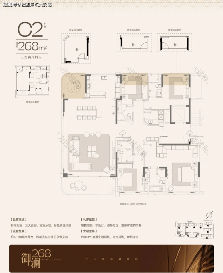 纯粹的五房四卫格局,已是改善家庭的空间顶配。但天澜传序府的思考更为深邃:它做了南向双套房设计,且将两个卧室精巧地分隔在两端。