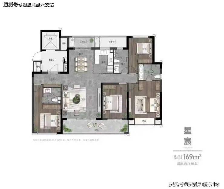 建面约169平户型是整盘最大面积段,位于中庭楼王位置。