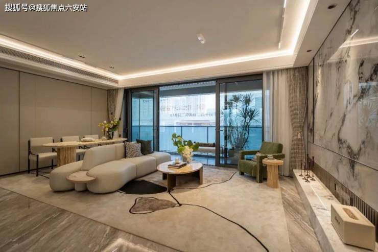米白色的沙发宛如一朵轻柔的云朵,静卧于温润的大地色地毯之上,搭配深绿色的休闲单椅,犹如绿叶与繁花的邂逅,为空间添上一抹灵动。阳光透过大幅落地窗倾洒而入,映照在大理石纹理的墙面上,光影交错,如梦如幻。一旁的绿植生机勃勃,整个客厅弥漫着温馨而宁静的氛围。