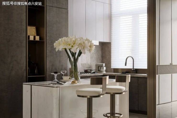 在日常生活中,厨房不仅仅是烹饪和食物准备的空间,还承载着情感的交流。开放式的餐厨空间设计可供家人朋友的聚会交流,以及展示男主人收藏的酒具和女主人喜欢的杯碟及艺术小画。