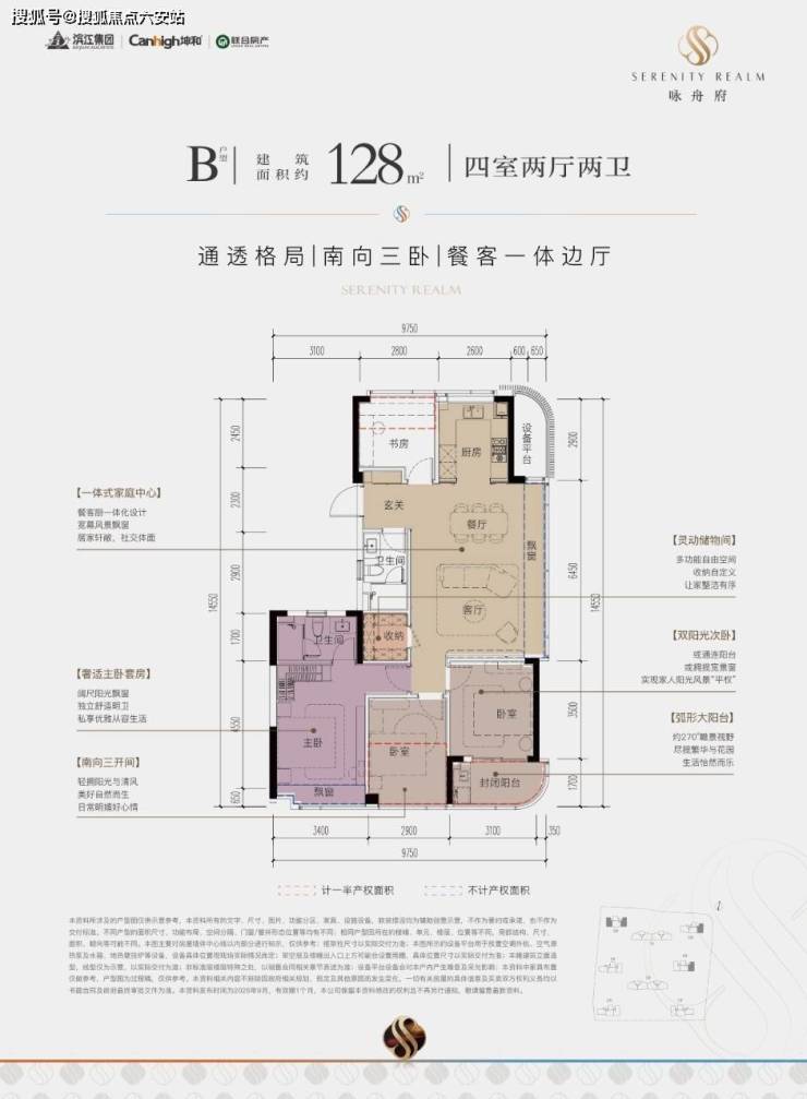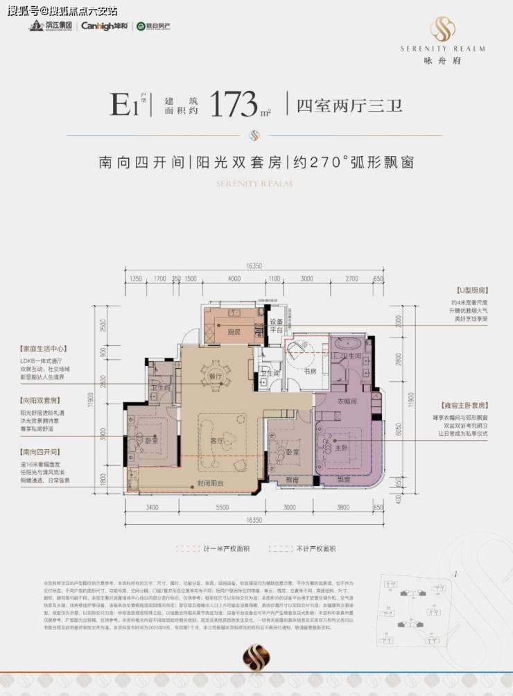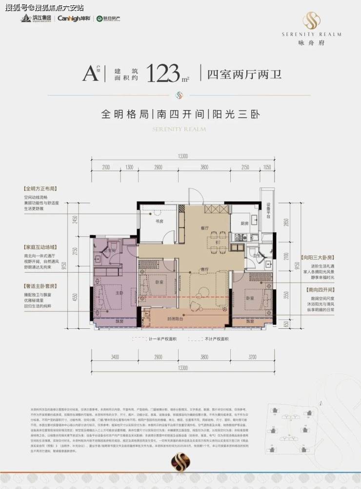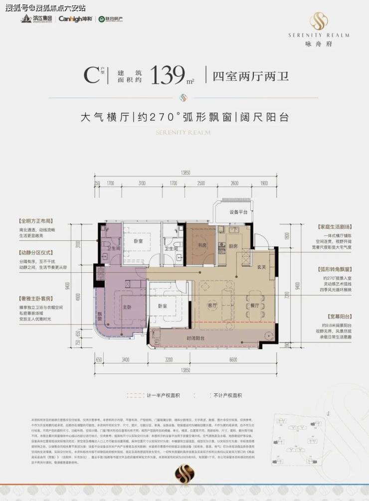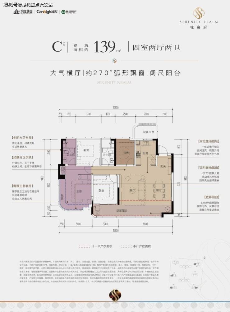 一款是四开间朝南的横厅户型,南向约13.85米的极致采光面,阳台也有约9.8米;动静分区,私密感超强;主卧套房带L型弧形转角飘窗,居住体感堪比全景舱。