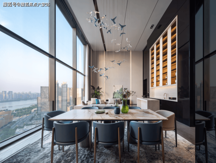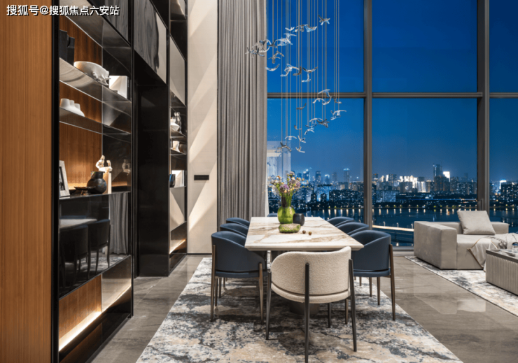 4.3米层高的落地窗系统将城市景观转化为动态画幕:西侧莲花碗体育场的钢结构穹顶如盛放的白莲,东侧杭州之门双塔勾勒出未来主义的几何韵律,而154公顷的奥体公园则像一条翡翠项链,将运动场馆、商业综合体与住宅区串联成有机整体。