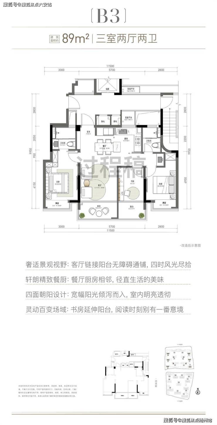 空间格局:四开间朝南,面宽约11.5米,媲美120方户型采光面;