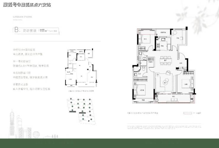 而(建面约)118方户型为经典四叶草格局,南向三开间,面宽达到了约10.4米,客厅与次卧贯通的长阳台近6.8米长,观景休闲、惬意无边。