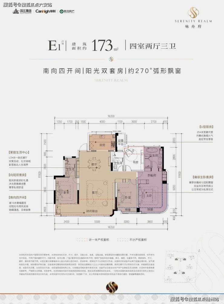 建面约173㎡E1边套户型,4房2厅3卫,类一梯一户,四房朝南,南北通透,主卧为大面积弧形转角窗设计,含赠送得房率约89%左右。