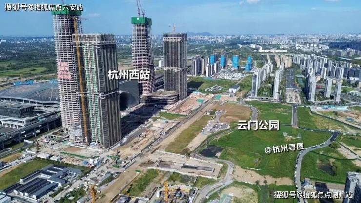 云门公园北侧便是杭州西站,在建高楼为设计高度约320米的“金手指”综合体,预计整体在2028年投用。