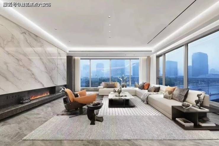 东区建面约320户型,将艺术感进一步融入日常中。特别设计的专属门厅空间,是从电梯厅延伸到家,如同一处艺廊,放慢人的情绪;室内选用了浅金色奢石(外界也称其为“芬迪白大理石”)作为主要的石材,曲面的木饰面也为浅色,整体给人以明亮感。