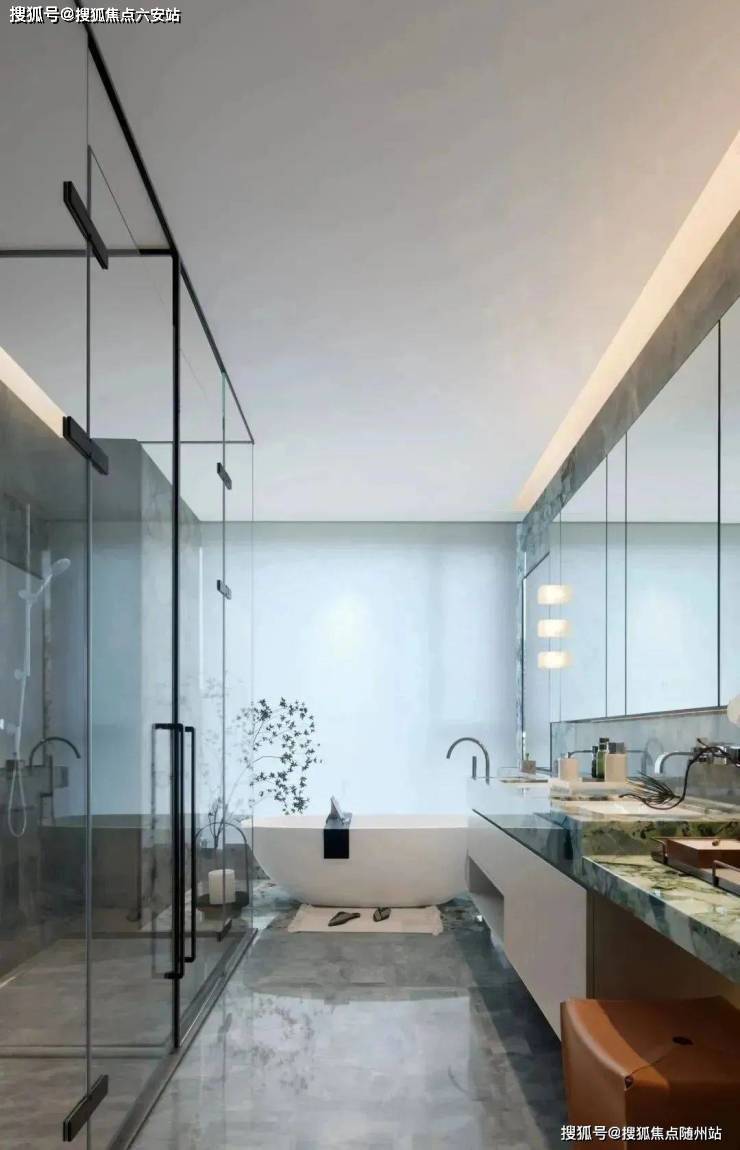 穿过一小段走廊,到主人的休憩区,先是舒怡的衣帽间,朦胧柜饰面,让休整充满优雅从容。卫生间以星雅灰大理石覆面,独立浴缸旁则用冷翡翠奢石点缀,一侧更设有整面玻璃,通透明亮。若沐浴间小酌,望见城市界面,于雅居见繁华。