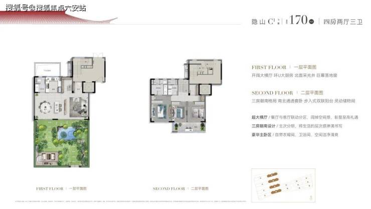 比如建面约170㎡的双层下叠四房两厅三卫,约9.7米面宽,三开间朝南的大四房格局。首层餐厅、客厅、品茶厅三个空间横向舒展,有机组合、互不干扰,单层就撑起了大平层的排场;窗外,还自带一个约9.7米宽的超大花园,满足各种野趣需求;二层是3个房间朝南,奢配约5.6米大阳台,两房联动,舒适自然。